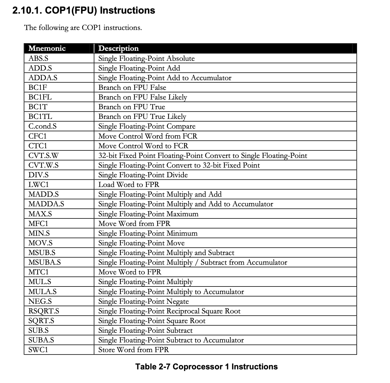 Quick thing to explain before we dive into this: the floating point numbers operations in the PS2 are done inside a coprocessor called COP1. It handles only single-precision floating point numbers (ie. float and not double).