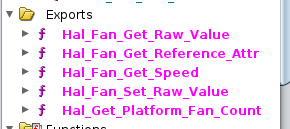 That DAT_006159d5 is read in many places before a prinntf, so we’ll just rename it to DEBUG_FLAG to keep it clean. The Fan_Service_Handler_7XXT is used in all debug strings in this functions, and based on the other ones this function is actually the fan service handler. Good, we seem to be in the right track then, I guess? This function also calls a very interesting one: Hal_Fan_Set_Raw_Value, imported from an external library, libnhal.so. Opening that lib gives us some very interesting exports!