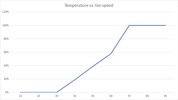 The curve is defined by specifying the base temperature and the PWM value for it. For example, the string 30:0,40:50,50:100,60:150,70:255 means the following: