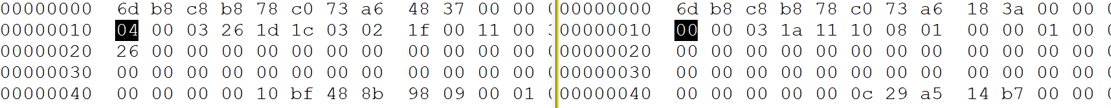 A simple find and replace for binary strings should do the job. Replacing 66c705ed5e27009c22 for 66c705ed5e27001071 will change the 0x229c for 0x7110, and 66c705e65e27007072 for 66c705e65e27007619 will change 0x7270 for 0x1976. Sure, I could have used those 0xffff at the end to patch my CPU, but that’s for a next day. And, sure enough, after patching those two instructions, the Probe_Nas_Pch returned 3, the same index as the NAS itself. This allows some other calls to carry on, which is great for initializing the device.