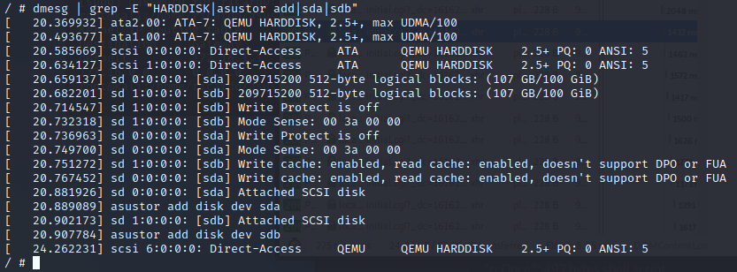 Since nothing is easy, it wouldn’t detect any disks. I honestly kinda expected this. Hey, I’m running the firmware on a very unsupported hardware and most of the things it does on the web interface is over those CGI binaries, and they need a bunch of information from the hardware itself to work. The CGI call actually helps debugging this out: we call list-disk and get an error as output. We can even see the disks getting detected by the kernel as well.